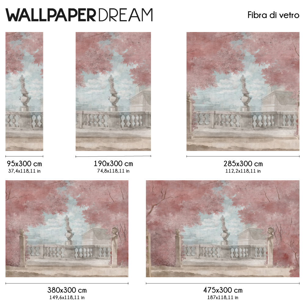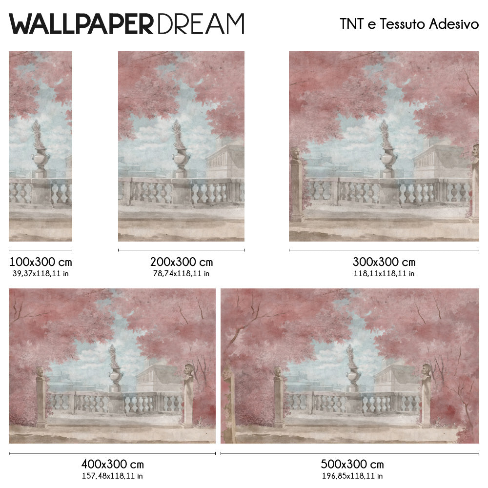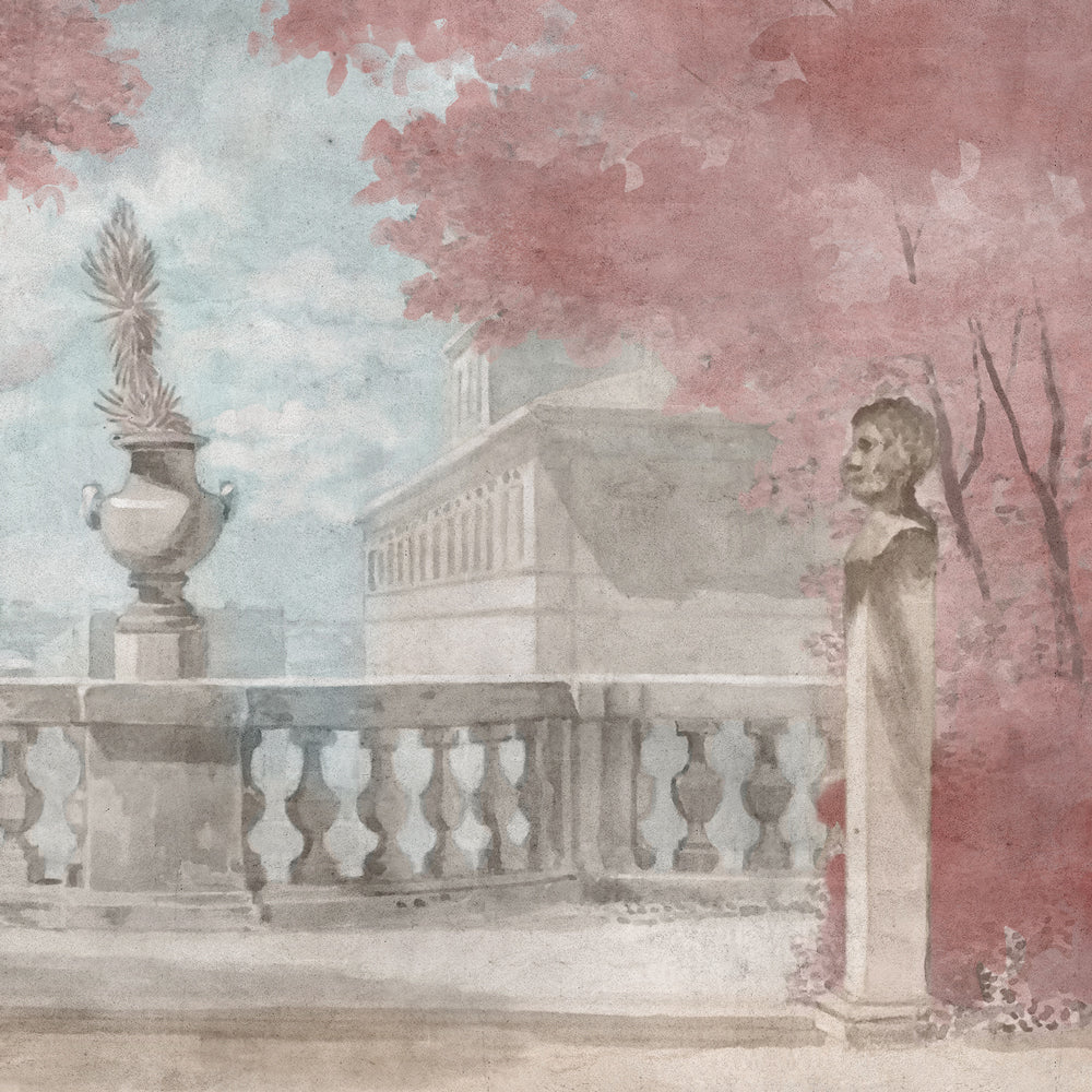 La carta da parati vintage 'Portico neoclassico' raffigura, attraverso la delicata tecnica ad acquerello, un'antico affaccio su una città in stile neoclassica. I fiori di ciliegio incorniciano statue e la balconata di questa carta da parati portando ventata di romanticismo e freschezza alle tue pareti. Ideale per ogni ambiente della casa in cui si desidera portare l'unicità e la preziosità dei tempi antichi. La texture effetto affresco rende questa grafica unica preziosa e originalissima.