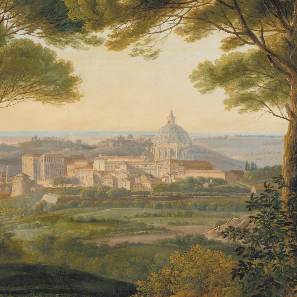 A differenza delle vedute moderne, questo design celebra la Roma dell'800: un paesaggio dove le maestosa cupola del Vaticano fa capolino dalla vegetazione lussureggiante. Grandi pini marittimi, cipressi secolari e rampicanti avvolgono la città antica, creando un equilibrio perfetto tra architettura e natura.